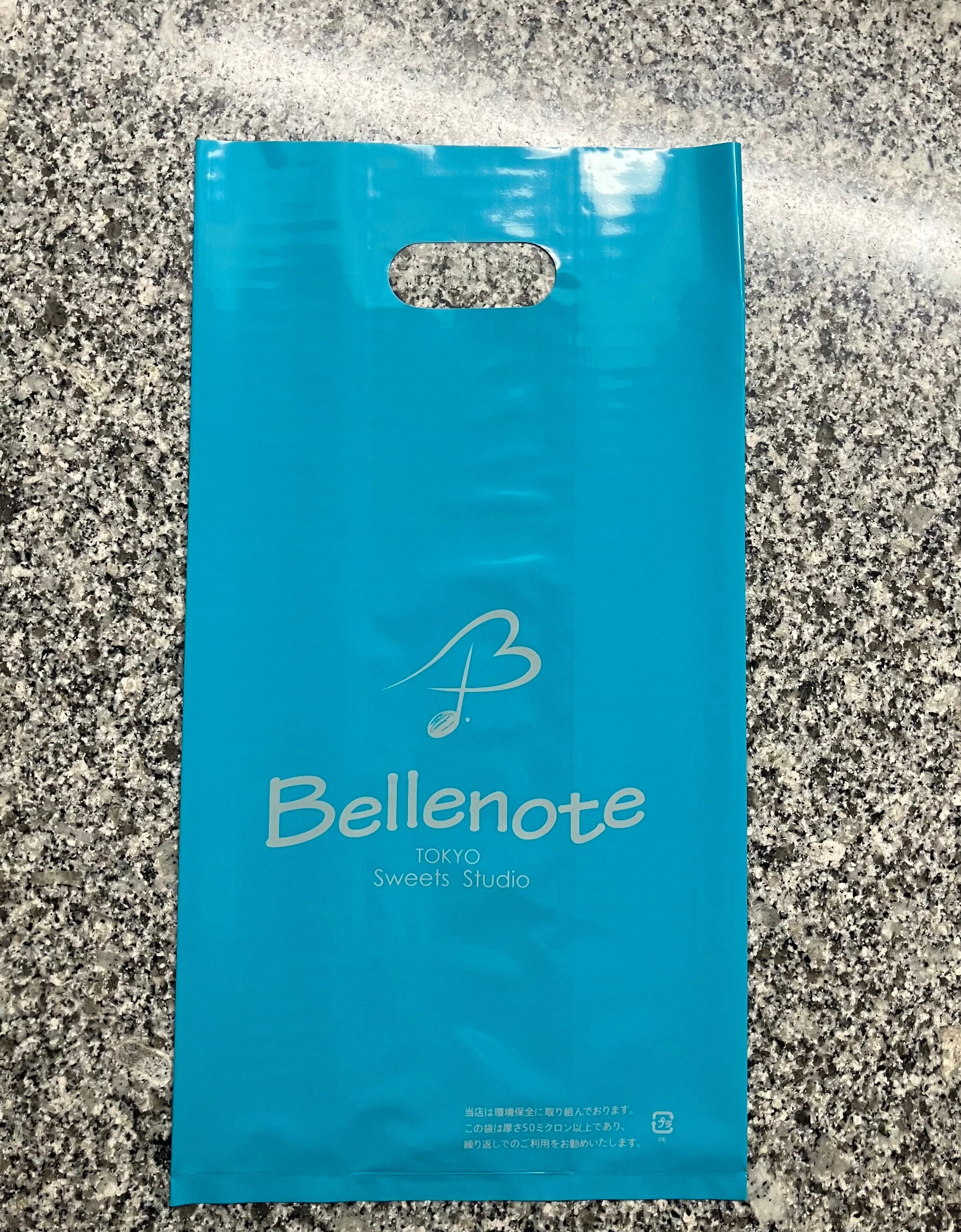 店のファサードを思わせる爽やかなターコイズブルーのビニール手提げ袋。